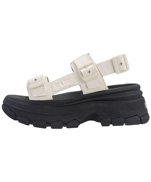 オールスターの厚底サンダルモデル。トレックウエーブと連動したボリューム感のある厚底ソールに、大きくカットアウトしたパターンのアッパーを採用した一足。アッパーにはシンセティックレザーやメタルのバックルを取り入れたファッショナブルなデザインがポイント。ベルトの裏にゴアを隠すことで、着脱性とフィット感を向上。ボリュームのある圧縮E.V.A.ソールと足なりに沿ったE.V.A.フットベッドの二層構造により、快適な足入れ感と優れたクッション性を実現。