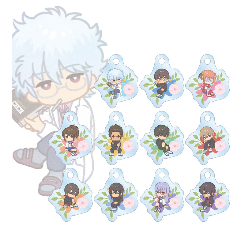 坂田銀八、志村新八、神楽、志村妙、近藤勲、土方十四郎、沖田総悟、山崎退、桂小太郎、猿飛あやめ、高杉晋助のイラストをボタニカルデザインに落とし込んで繊細なタッチで新たに描き起こし、ダイカットのアクリルチャームに仕上げました。