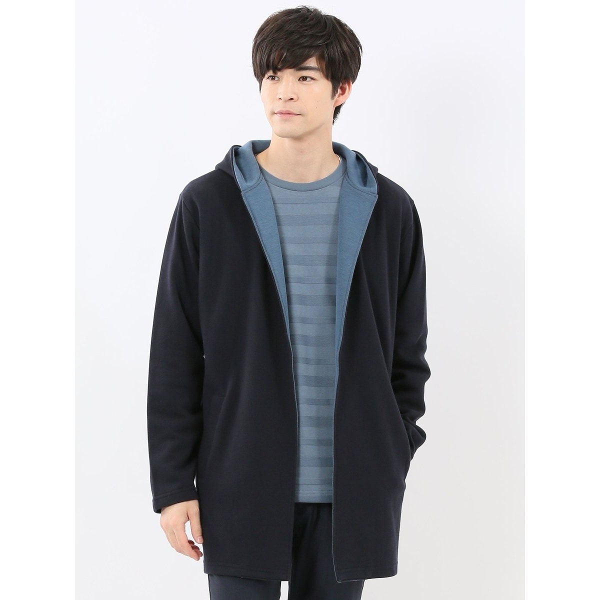 ボタンレスでラフに羽織れる、ロング丈のフーディガンです。シャツやカットソーの上に羽織るライトアウターとして便利な一枚。ポケット付きで利便性にも優れています。