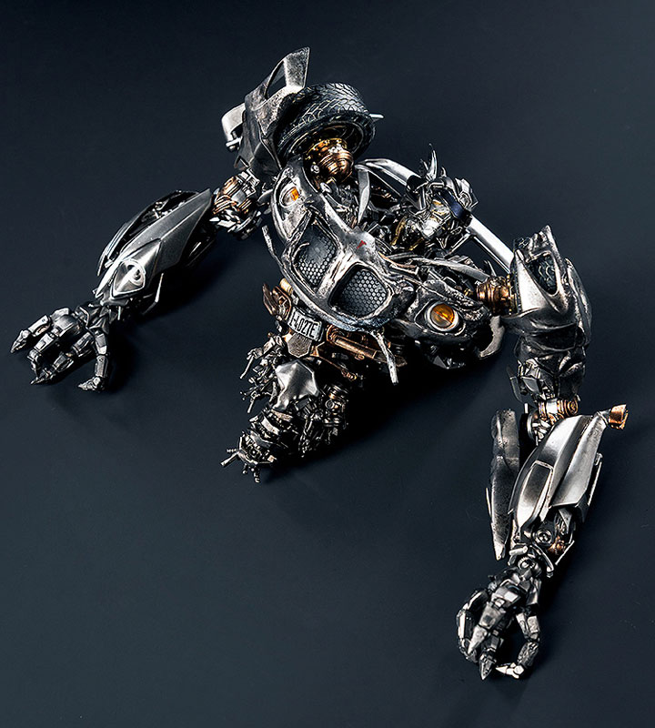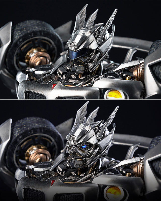 「DLX ジャズ」は劇中のロボットモードを忠実に再現したフル可動フィギュアです(非変形)。高さ約19cmで、マルチレイヤー塗装とthreezeroの得意とするウェザリング表現が施されています。ダイキャスト製金属を用いた内部フレームにより、手に持った時の心地よい重さと共に約65ヶ所の可動ポイントを実現。また、ハンドパーツはDLXシリーズ初となる指のフル可動を実現。LED発光機能は両目、クレセントキャノン、そしてヘッドライトとテールライトに搭載。目を覆うバイザーはクリアパーツ製で、脱着可能です。他、DLXアクションスタンドが付属。