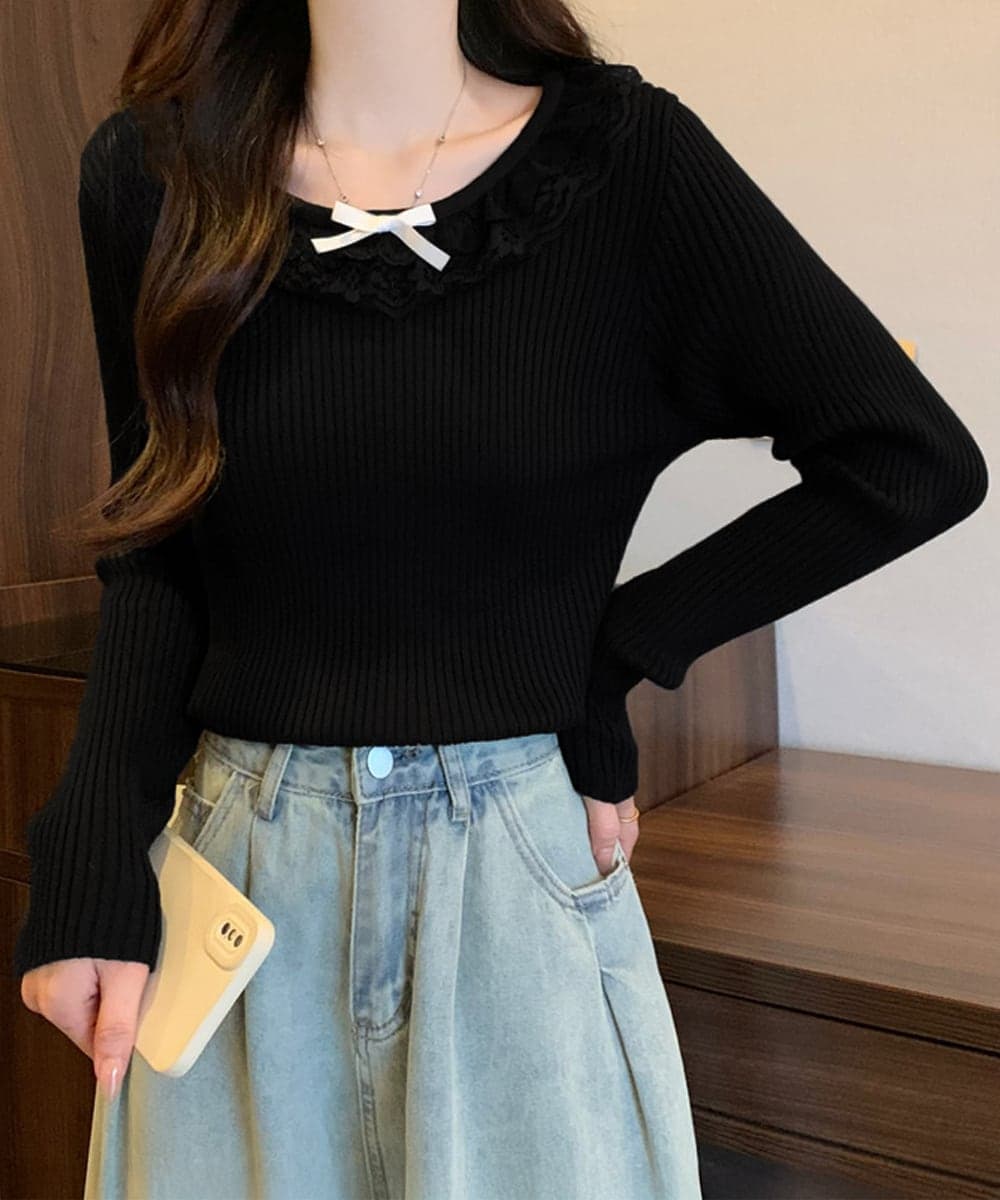 襟元にあしらわれたレースとリボンが、さりげなくフェミニンな雰囲気をプラス