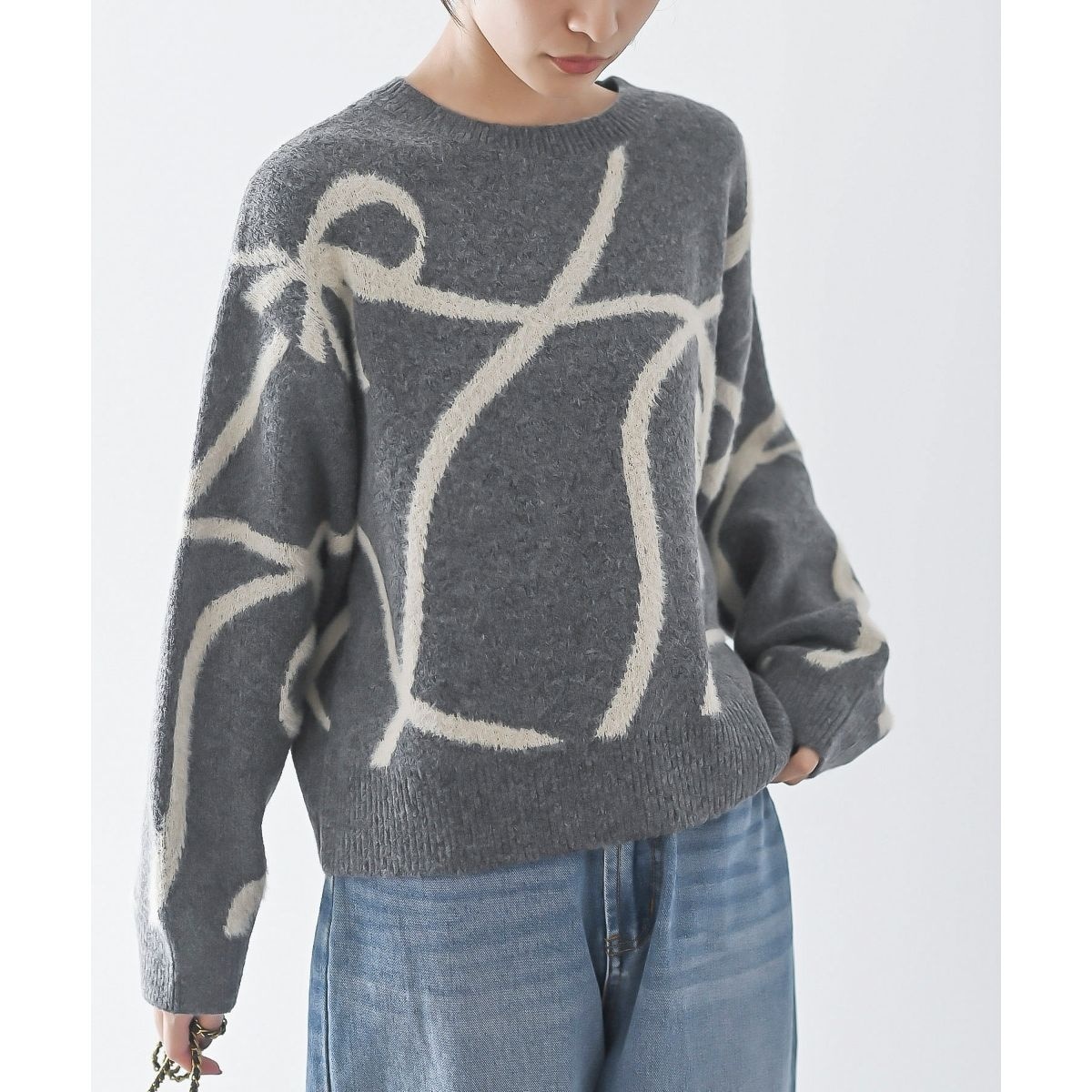 ビンテージ リボン柄シャギーニット プルオーバー グレー ガーリー レトロ 花柄 フェミニン ふわもこ ガーリー 軽量 軽い オシャレ
