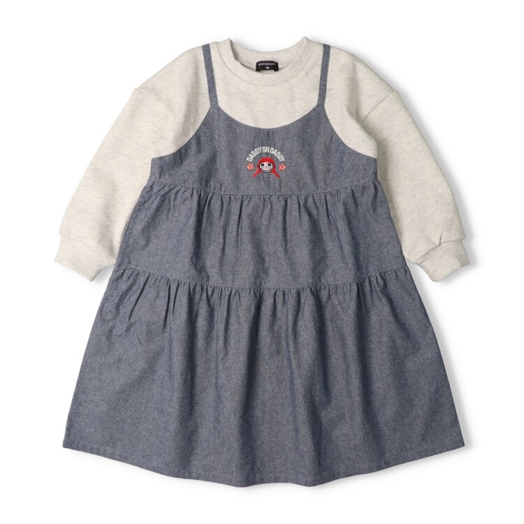 デニム風のダンガリー素材のフレアーなティアードのキャミワンピースと裏毛素材のトレーナーのドッキングデザイン。1枚で重ね着が楽しめるワンピース。ダディコちゃんのワンポイント刺繍もポイント!【アイテム】トップス シンプル ガーリー フェミニン カジュアル お洒落 オシャレ かわいい 可愛い 普段着 デイリーウェア お出かけ着 お外着 お外遊び着 子ども こども 女児 女の子 ガールズ キッズ ベビーサイズ トドラーサイズ 幼稚園 保育園 小学校 通園 通学 小学生 2025年秋冬物新作 丸高衣料 ロングスリーブ 長袖 グレー ダディオダディ