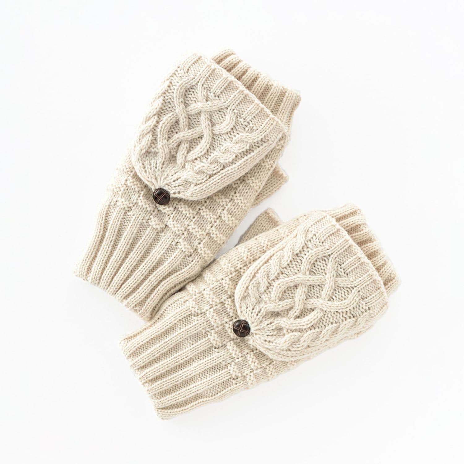 凹凸感のあるほっこりやわらかな雰囲気のフード付きケーブル編みニットグローブ。裏地はやわらかくあたたかなマイクロボアを使用。