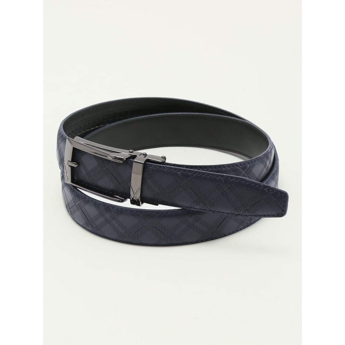 表側はチェック柄の型押し加工をほどこした牛革レザー、裏側は合成皮革です。スクエアバックルでスタイリッシュに仕上げています。シックな大人の男の装いを引き立ててくれる上質感が魅力です。