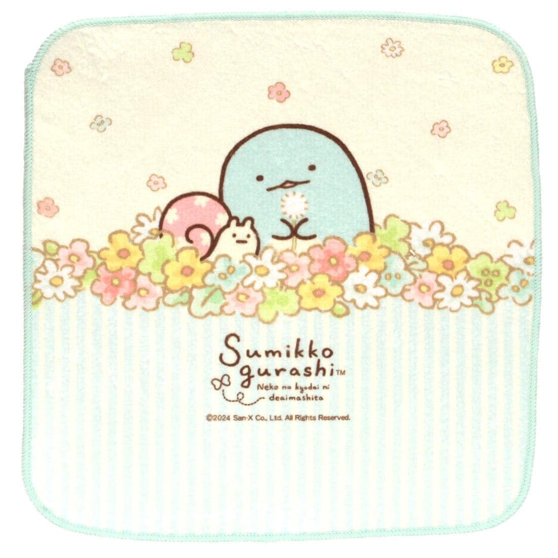お友達の「ふろしき」と一緒にお花畑にいます。ほっこりするスチュエーションのデザインにしました。