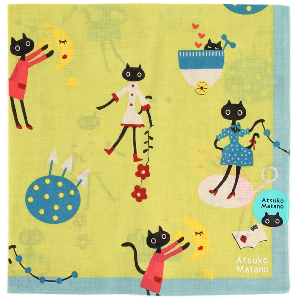 とにかく売れっ子のMEMEちゃんですが、今回はそんなMEMEの休日を描いています。休日とはいいながらも、そりのようなものに乗ったり、月や星と戯れたりと、アクティブな様子のプリントハンカチです。
