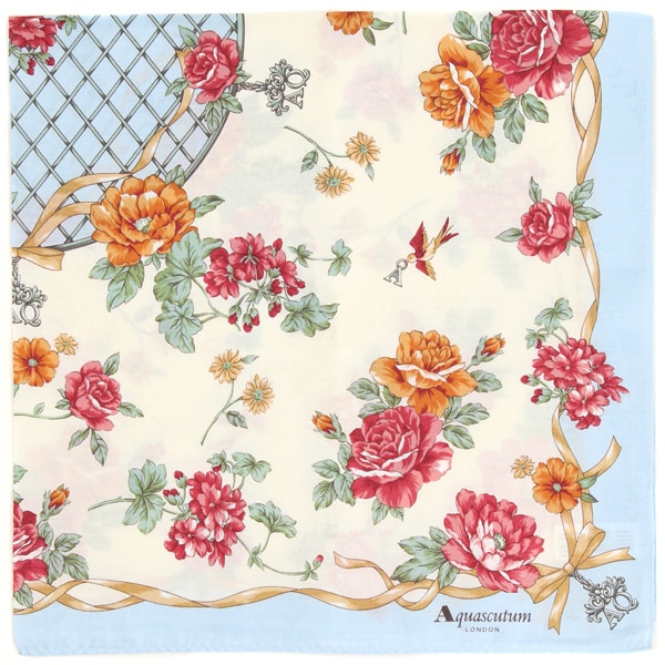 2025年春夏のテーマ『英国カントリー風大邸宅』を背景に、庭園風景がデザインのインスピレーションになっています。庭園に咲き誇る花々、そしてアクアスキュータムの『A』『Q』を携えて庭園に訪れる鳥がモチーフの、エレガントで華やかな1枚です。