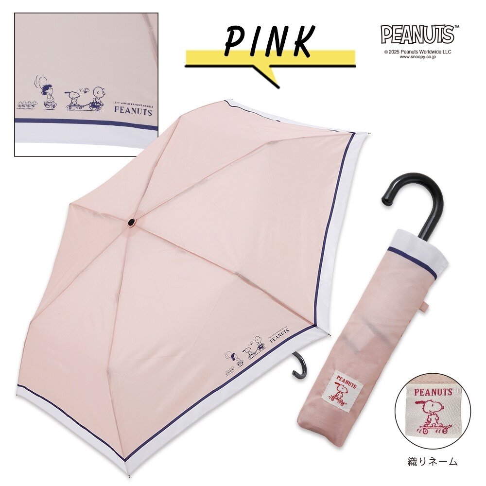 バッグに入れて持ち歩ける折りたたみタイプの雨傘です。スッキリとしたスタイルでありながら、雨から身体をしっかり守ってくれるサイズ感になっています。収納袋にスヌーピーの織りネーム付き!