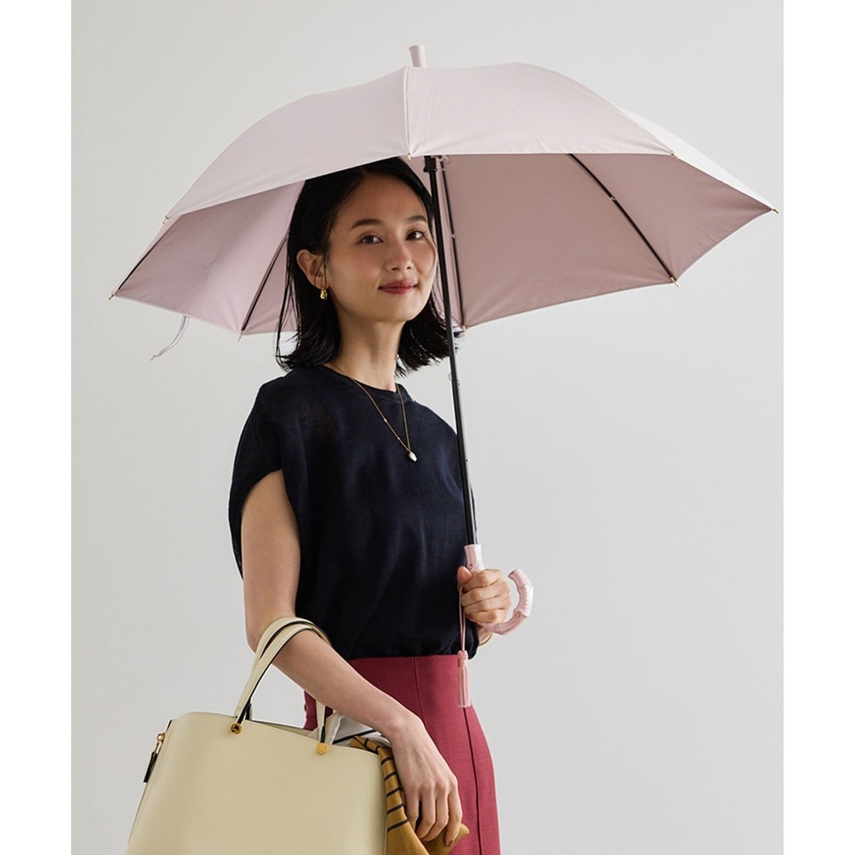通常裏のコーティングが黒になりがちな日傘ですが、上品な同色系の裏コーティング生地を使用し、女性らしい印象の淡いトーンでまとめています。