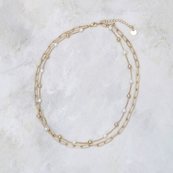 華奢なチェーンとフェイクパールが美しく重なり合った2連ネックレス。