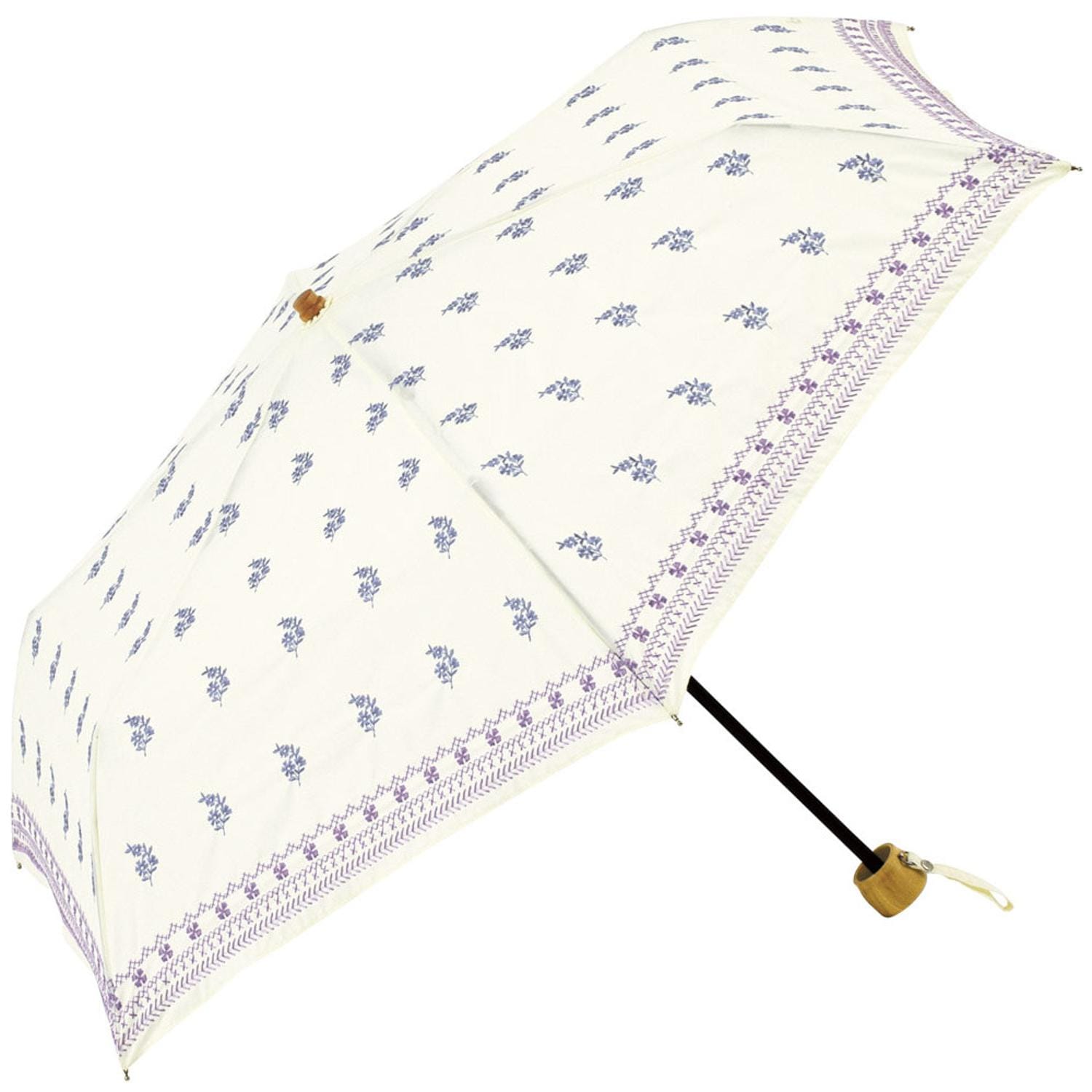 【お出かけの頼れる相棒に♪】機能性とデザイン性を兼ね備えた、晴雨兼用タイプ。「because 折りたたみ傘」。【気になる紫外線をしっかりカット】紫外線遮蔽率は濃色95%以上、淡色90%以上!日差しの強い日の日焼けや熱中症対策に。【お天気が不安定な日にも対応】傘生地に防水加工も施しており、ちょっとの雨なら大丈夫。(※)日傘を主として作られた商品のため、長時間の雨傘としての使用はご注意願います。【いつでもどこでもイージーオープン】傘骨をポキポキ折る手間なく、スムーズに開閉できる手開き仕様。【安心・安全のセーフガード付き】爪や指を挟むのを防止するカバーを装備。開閉時のケガを防ぎ、ネイルを施した爪も保護。【サクッと留められるボタン式バンド】傘生地を留めるバンドは、バチンっと留めやすいスナップボタン式。【持ち歩きに便利な収納袋付き】傘生地と同じカラーの収納袋が付属。カバンに忍ばせて、スマートに持ち運び。【夏の空にぴったりなナチュラル感】風合いのある生地に刺繍をプラス。ウッド調のハンドルや石突もアクセント!