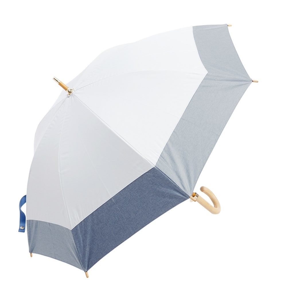 【質感の違いを楽しむ、ワンランク上の日傘】異素材感のあるダンガリー調の生地と無地生地を組み合わせたデザイン。中棒は木のぬくもりを感じられ品のある木棒仕様。ネームバンドにはうねりのある独特な風合いが特徴のグログランテープを使用し、高級感と華やかさを兼ね備えた日傘になっています。