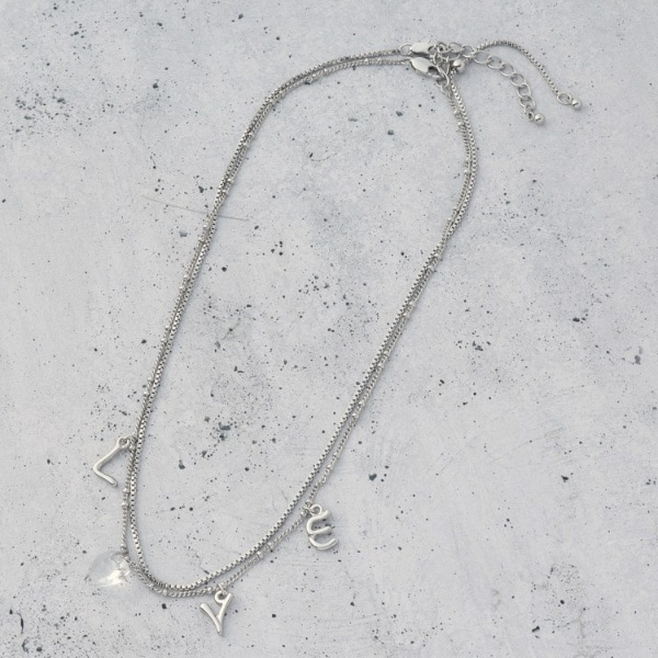 「LOVE」のアルファベットチャームがあしらわれた2連ネックレスは、シンプルで上品なデザインに個性あるアクセントをプラス。