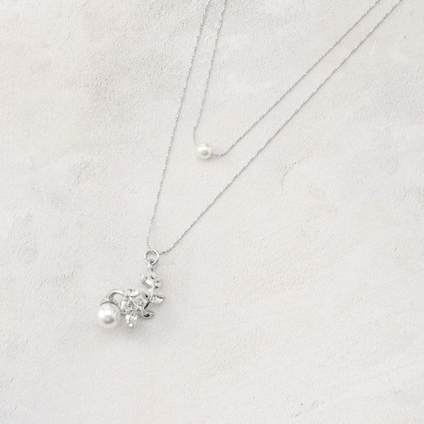 上品なフェイクパールと、繊細にデザインされたフラワーモチーフのビジューを組み合わせたワントップネックレス。