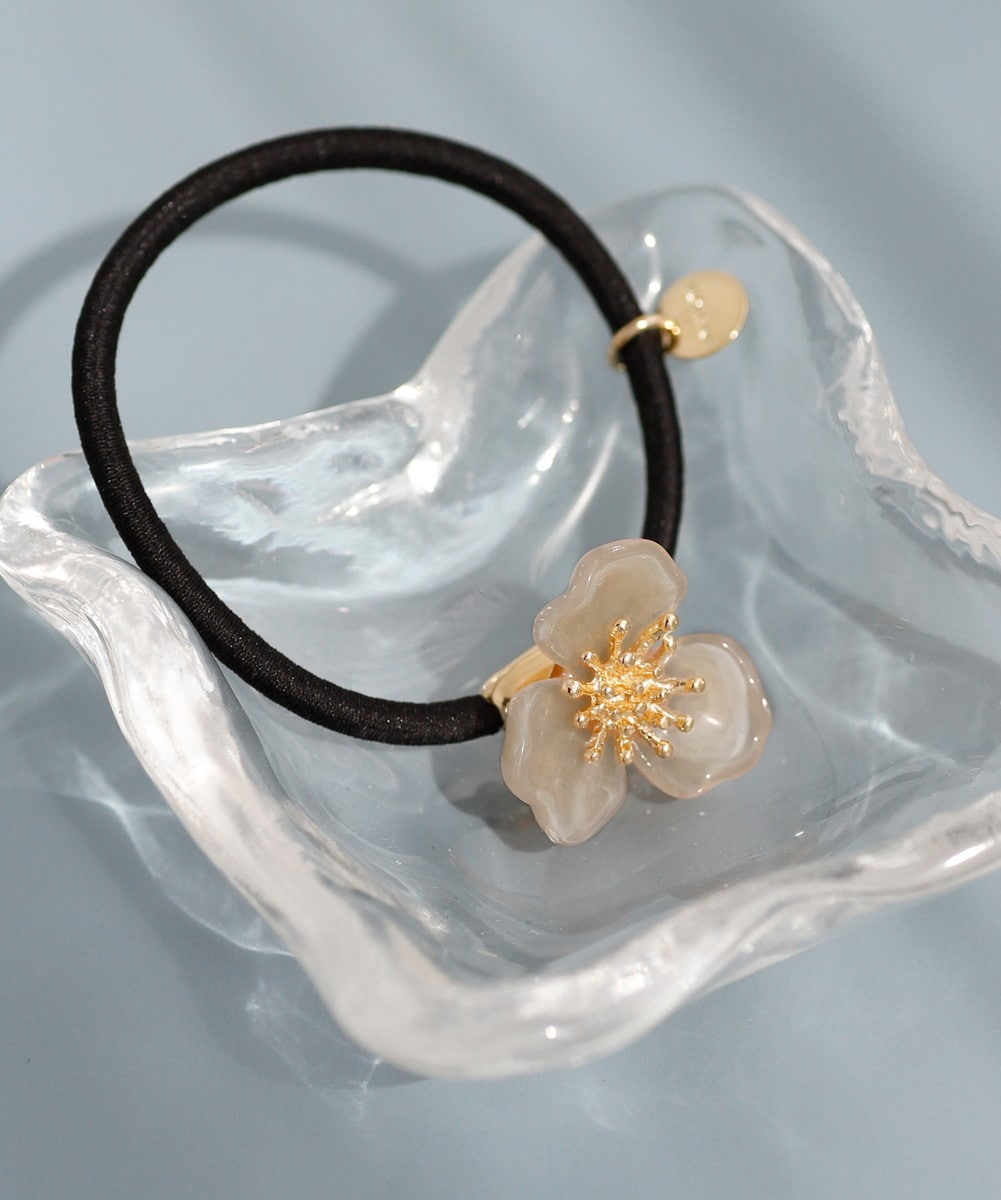 ニュアンスカラーのフラワーモチーフが、うしろ姿を可憐な印象に仕上げるヘアゴム。