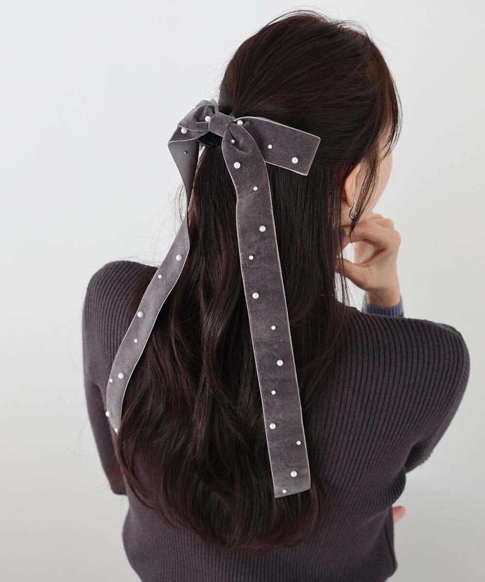 フェミニンなムードが高まるベロア&パールリボンシュシュ