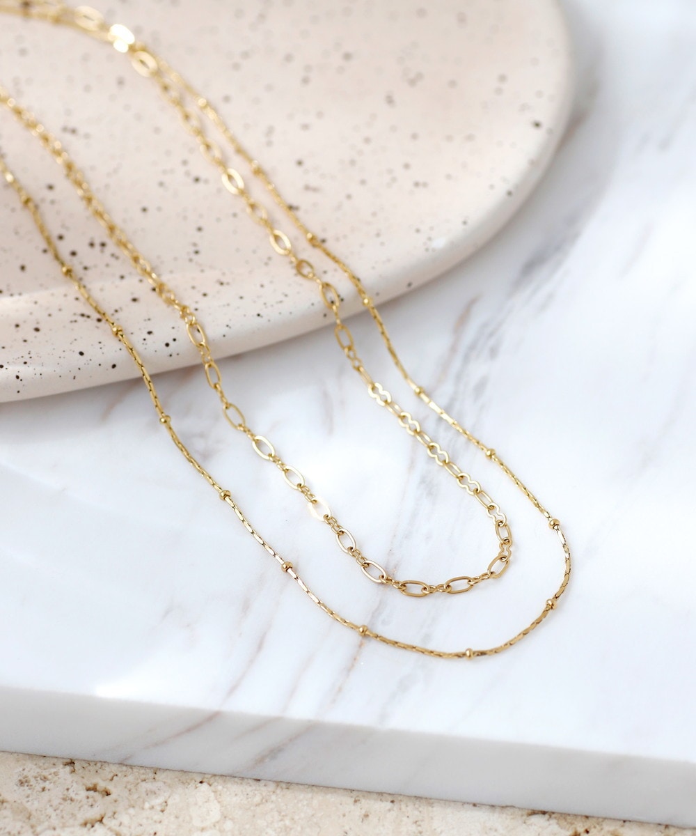 ドットチェーンとシンプルなチェーンの煌めきが、首回りをスタイリッシュに仕上げるネックレス。