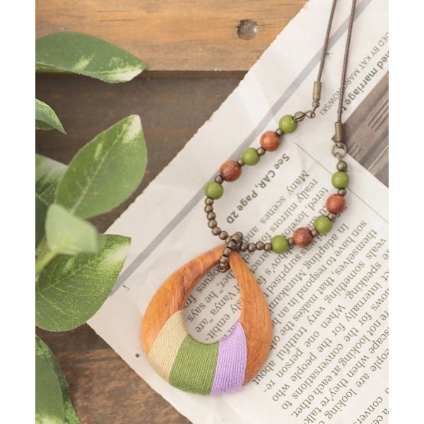 しずく型のウッドモチーフに3種類のカラーの糸を巻き付けたデザイン。