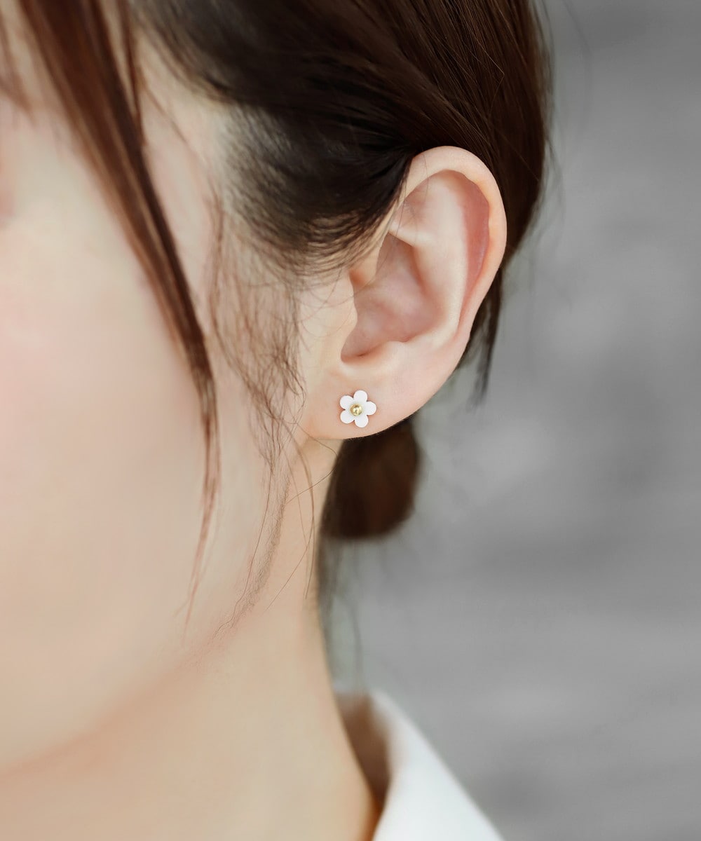 小ぶりなフラワーモチーフが、大人かわいい横顔に導くピアス。