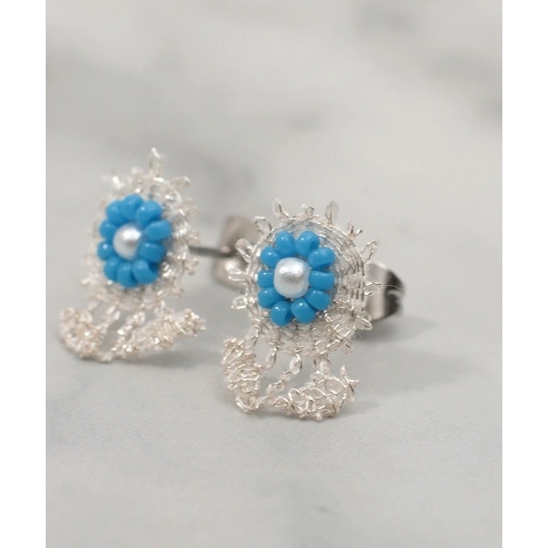 ビーズで作られたお花と、細かい刺繍の縁取りがキラリと光るプチピアスです。