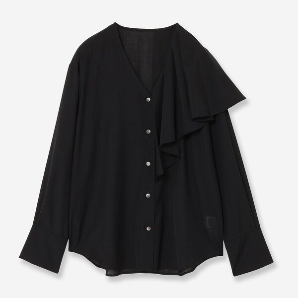 アシンメトリーなフリルがエレガントなシルエットを演出するブラウス。