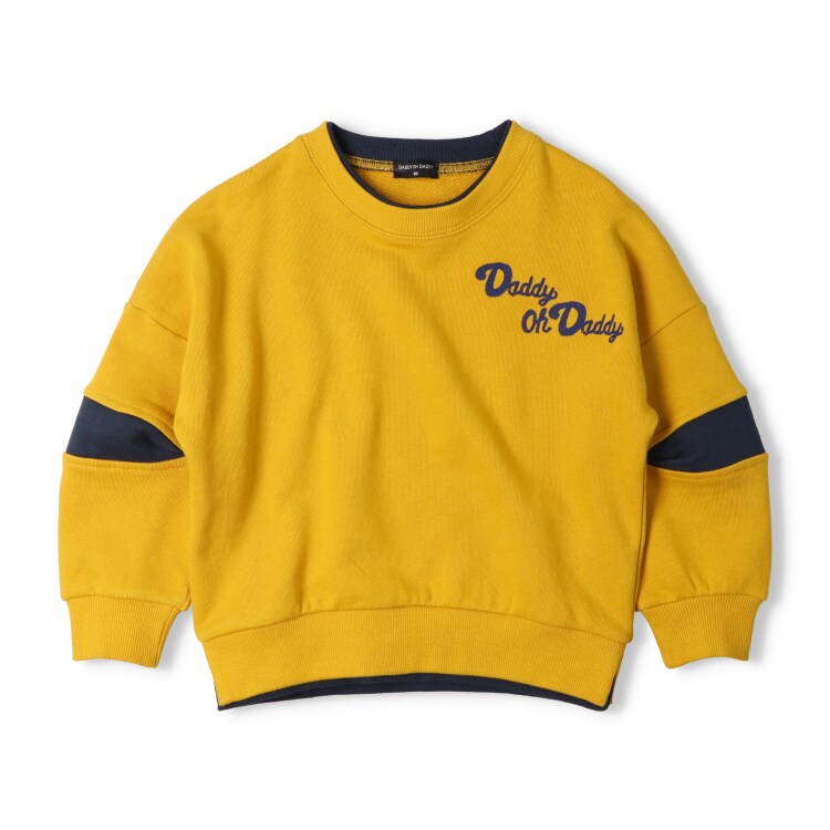 衿、裾、袖切替にのぞく配色デザイン!秋から春まで長く着られる裏毛素材のトレーナー、スウェット。チェーン刺繍のロゴもお洒落なポイント!ゆったりシルエットが可愛い!(ベビーサイズのみ肩ボタン仕様になります。)【アイテム】トップス カジュアル お洒落 オシャレ かっこいい かわいい 可愛い 普段着 デイリーウェア お出かけ着 お外着 お外遊び着 子ども服 こども服 男児 男の子 ボーイズ キッズ ベビーサイズ トドラーサイズ 幼稚園 保育園 小学校 通園 通学 小学生 2025年秋冬物新作 丸高衣料 ロングスリーブ 長袖 マスタード 黄色 ダディオダディ コットン100% 綿100%
