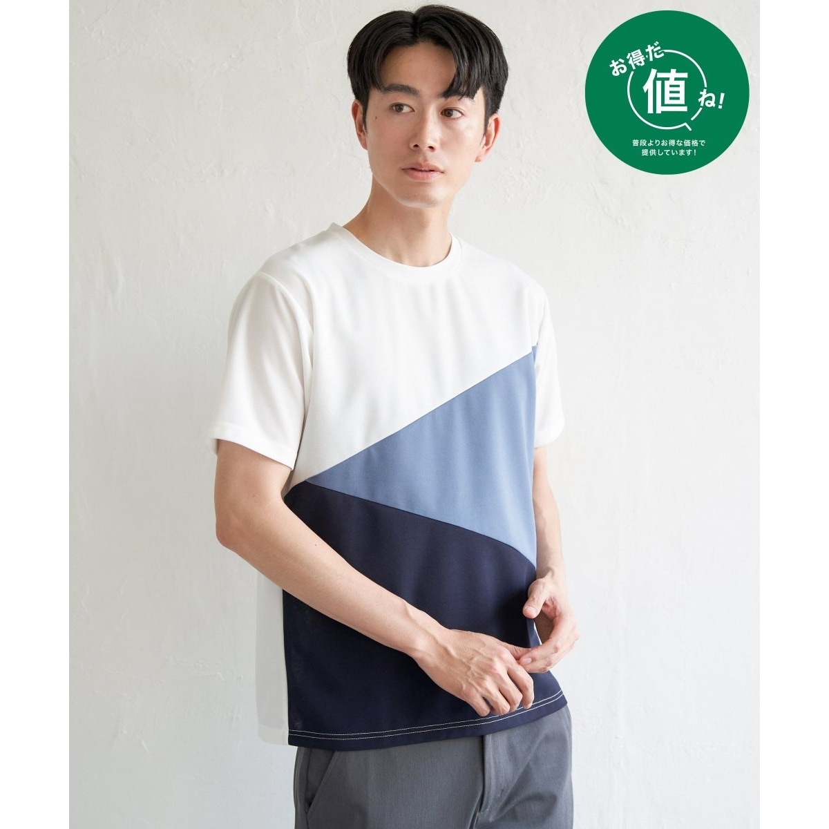 前身頃を3配色で斜めに切り替えた半袖Tシャツ。
