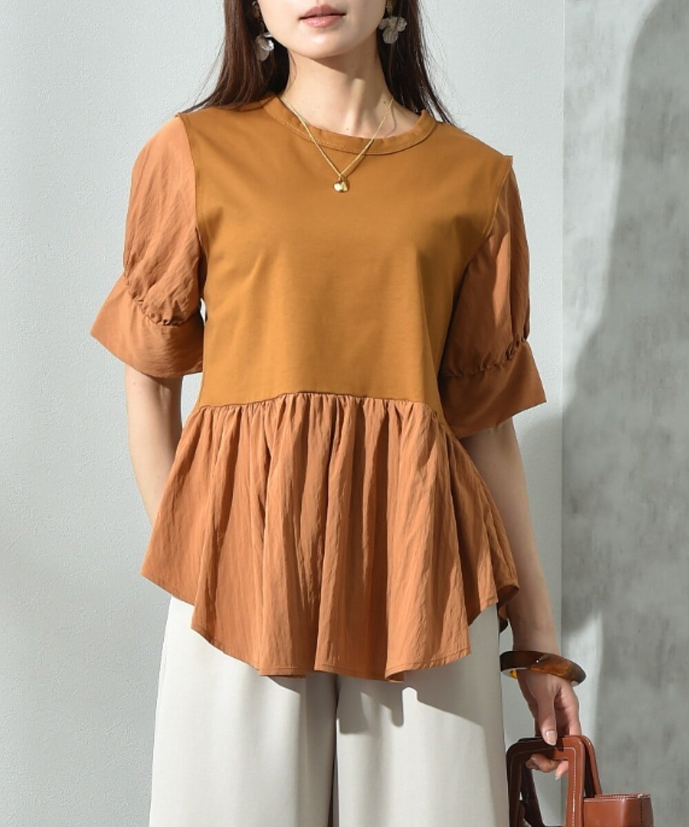 バランスよい着丈でゆったりシルエット!異素材切替で旬なスタイルが完成するお勧めな1枚です。本体はコットン100%の素材でサラリとした肌さわりが特徴◎袖とペプラムは絶妙なボリューム感が完成する柔らかい合繊素材を使用しています。