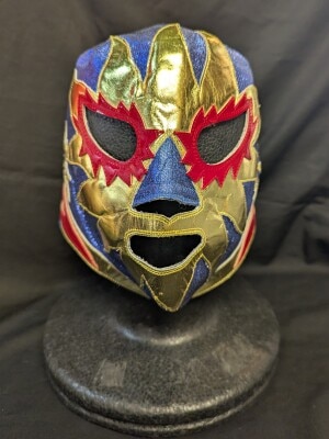 プロレスマスク アロンカナレス製【ドス・カラス(青×金・赤フチ)】 刺繍入り サイン入り 着用写真付き
