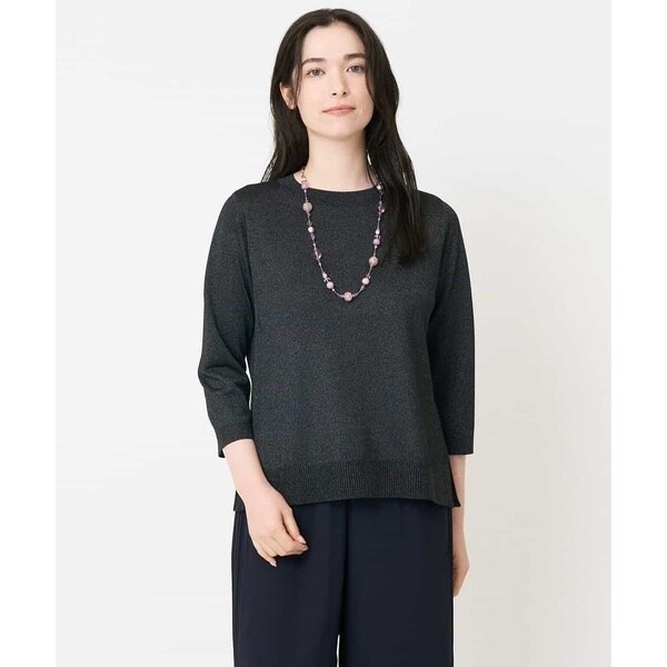 レーヨンポリエステルのラメ糸をプレーテイングし裏側にまわすことで、着用時に皮膚刺激の少ない、着心地の良い一着。