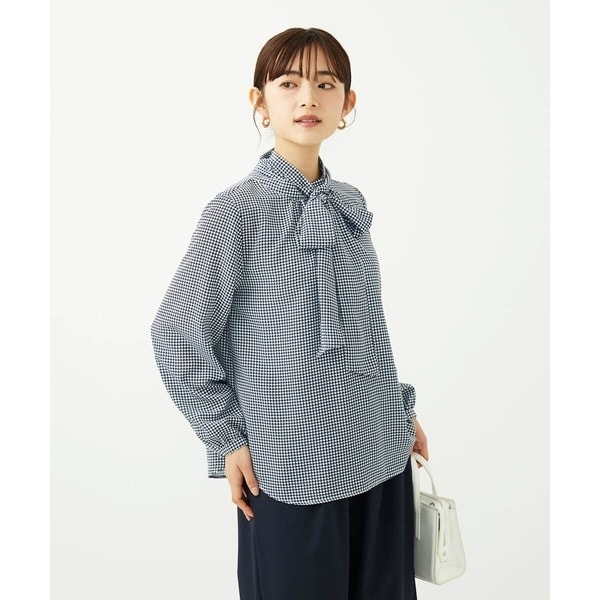 大人な印象で着こなせる千鳥柄チェックブラウス。首元を華やかに演出してくれるボウタイデザインです。ボウタイは取り外し可能。ボウタイを取り外すとシンプルなバンドカラーブラウスとして着用できます。