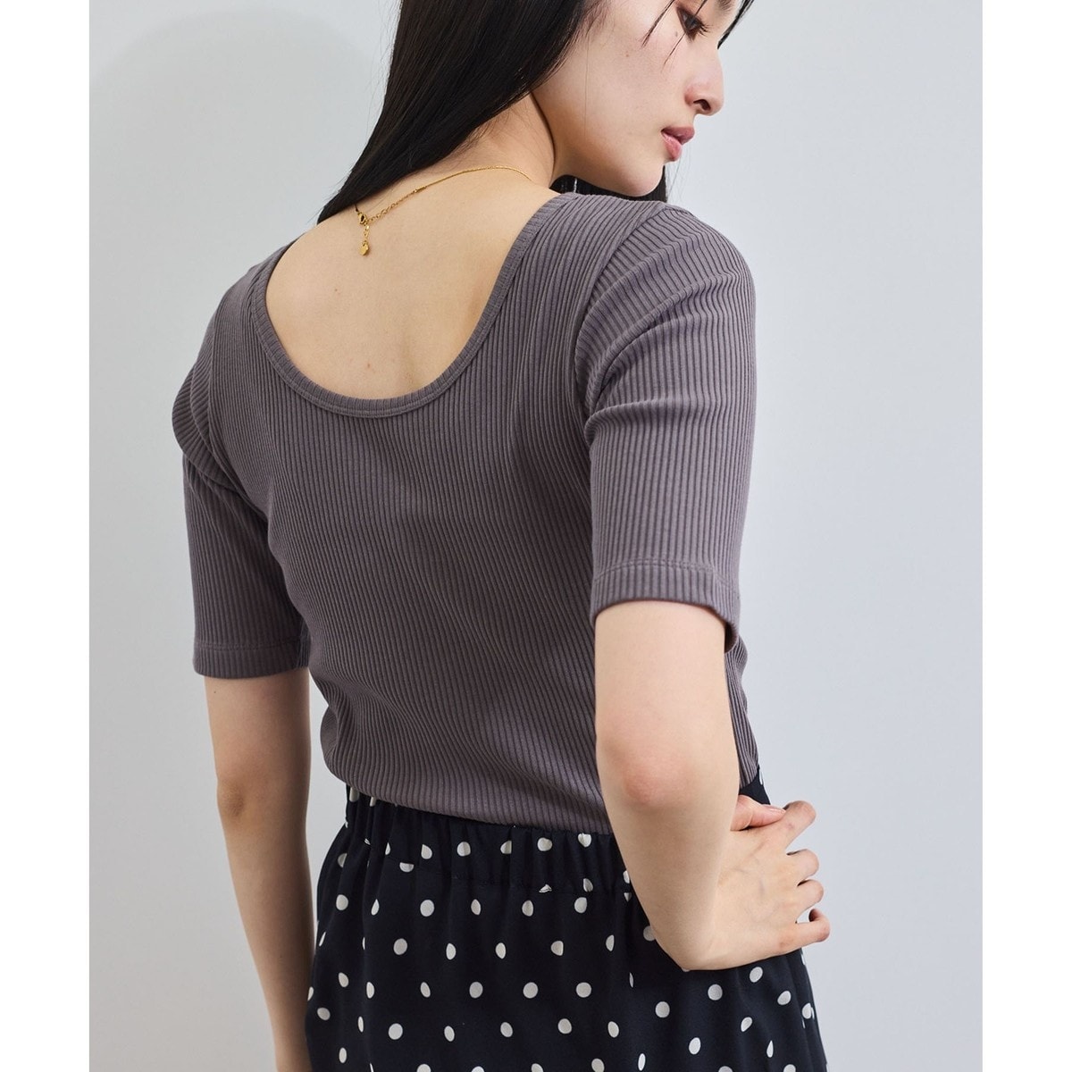デコルテがきれいに見える浅めのクルーネックと程よい深さのクルーネックの両方がコーディネットによって楽しめる前後2WAY五分袖プルオーバーです。