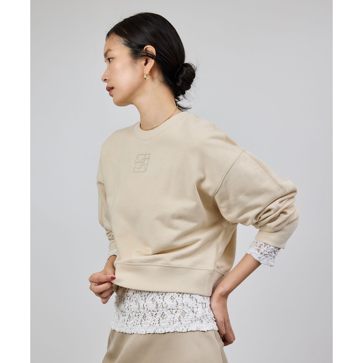 程よくゆとりを持たせたリラックス感のあるボクシーシルエットです。裾にはリブを施し、腰まわりに自然にフィットするバランスに仕上げています。首元を美しくすっきり見せる衿ぐりのラインにこだわり、シンプルながら大人らしい上品な1枚です。胸元にはアナグラム刺繍をさりげなくあしらい、ワンポイントのアクセントを添えています。