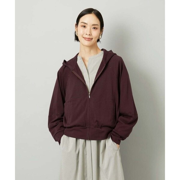 ほんのりシアーな表情が魅力のジップアップパーカーは、ラメ糸を効かせた3本針ステッチがさりげないアクセントに。