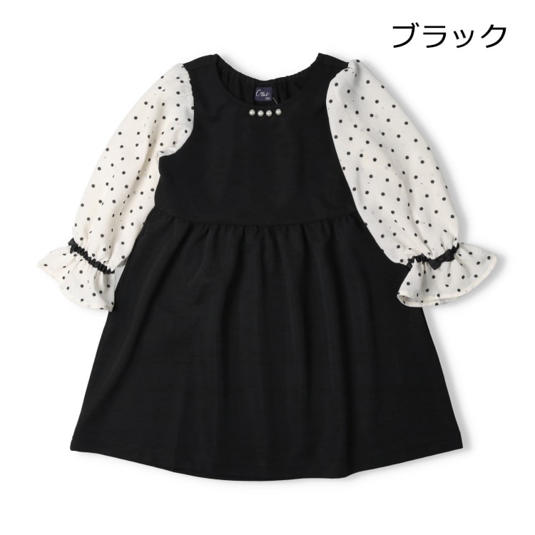 衿ぐりにブラックはパール、ネイビーにはリボンのモチーフ付。ぽわんとしたドット柄のシフォン素材の袖も可愛い!お上品な長袖ワンピース。プチフォーマルやオケージョンにもおすすめ。【アイテム】トップス シンプル ガーリー フェミニン カジュアル お洒落 オシャレ かわいい 可愛い 普段着 デイリーウェア お出かけ着 お外着 お外遊び着 子ども こども 女児 女の子 ガールズ キッズ ベビーサイズ トドラーサイズ 幼稚園 保育園 小学校 通園 通学 小学生 2025年春夏物新作 丸高衣料 ロングスリーブ 長袖 プチフォーマル 入園式 入学式 卒園式 りぼん 結婚式 七五三 オケージョン ハレの日 ブラック 黒色 ネイビー 紺色 クレセント