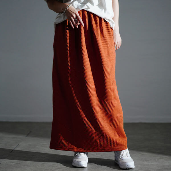 モードな雰囲気漂う大人な幾何学柄キルティングナロースカート。タイト&ロングシルエットが特徴的なトレンドのナロースカートで大人の女性のかっこいいスタイルを楽しんでいただけます。肉感を拾わないこだわりデザインで着痩せ効果も期待できます。後ろ姿は深めのバックスリットで色気漂う肌見せ&足捌き楽ちんなのも嬉しいポイント!しっかり伸びるウエスト総ゴムでストレスフリーな着心地◎