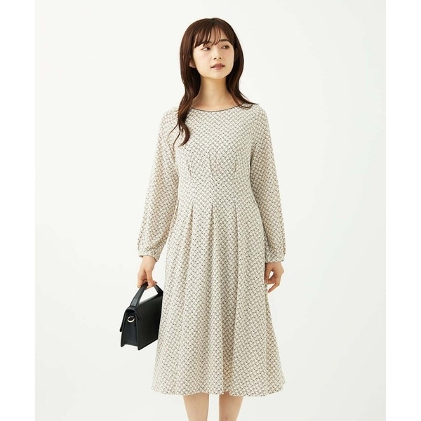 毎日の通勤にもマッチする落ち着いた雰囲気の幾何プリントワンピース。ウエストから上下に入ったタックがシルエットをきれいに見せながら、着心地の良さも兼ね備えた一枚です。