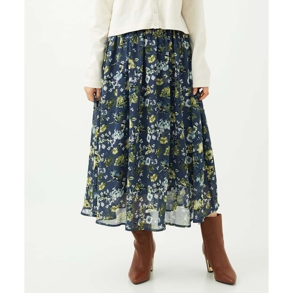 多配色でクラシックな雰囲気の大小ミックスの花柄シフォンスカート。甘すぎないトーンが花柄ながら大人っぽい。落ち感がある素材は広がりすぎないシルエットも嬉しい。ウエストゴムでストレスフリーな着心地です。
