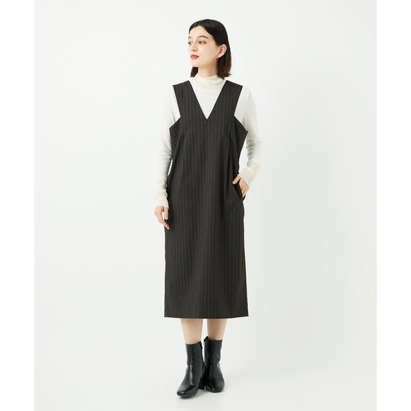 マニッシュでヴィンテージ感のあるストライプ生地でお作りしたトレンドのジャンパースカート。ジャンスカは半袖のTシャツやシャツブラウス、ニットなどインナー次第で長く着用できるところが魅力のアイテムです。ナローシルエットにVネック、脇の部分の地の目のタテヨコ切り替えなど、シャープなデザインに仕上げているので子供っぽさを感じない大人仕様のジャンパースカートになっています。後ろファスナー仕様で着脱しやすく、裾にはスリットが入っているので足捌きが良く、楽な着心地も高ポイントです。