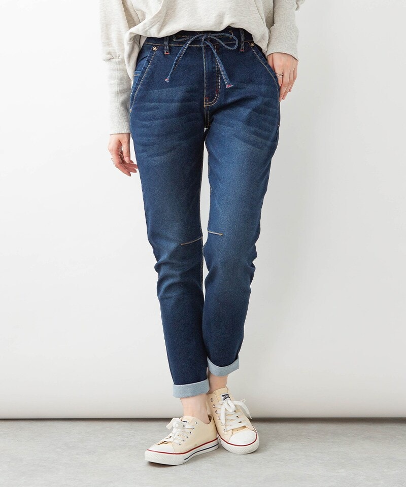 のニットデニムパンツ。ストレッチ素材を使用して高い伸縮性を実現し、履き心地ラクチン。ブラスト加工を施し、見た目はまるでデニム。リラックスしながらお洒落を楽しみたい方にオススメです。
