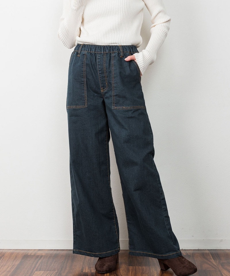 ウエストゴム+ストレッチ素材が履きやすいデニムベイカーパンツ。