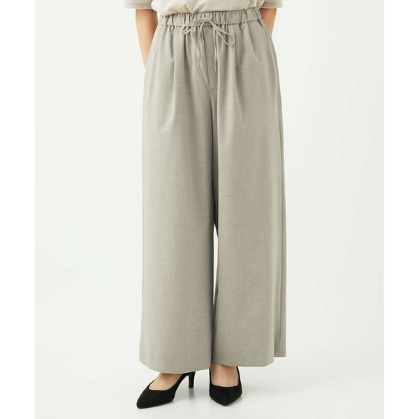 ストライプ柄と無地の二柄展開のワイドパンツ。ウエストはオールゴム仕様でフロントの共地紐で調節が可能。身体のラインがきれいに見えるストレートワイドシルエットです。