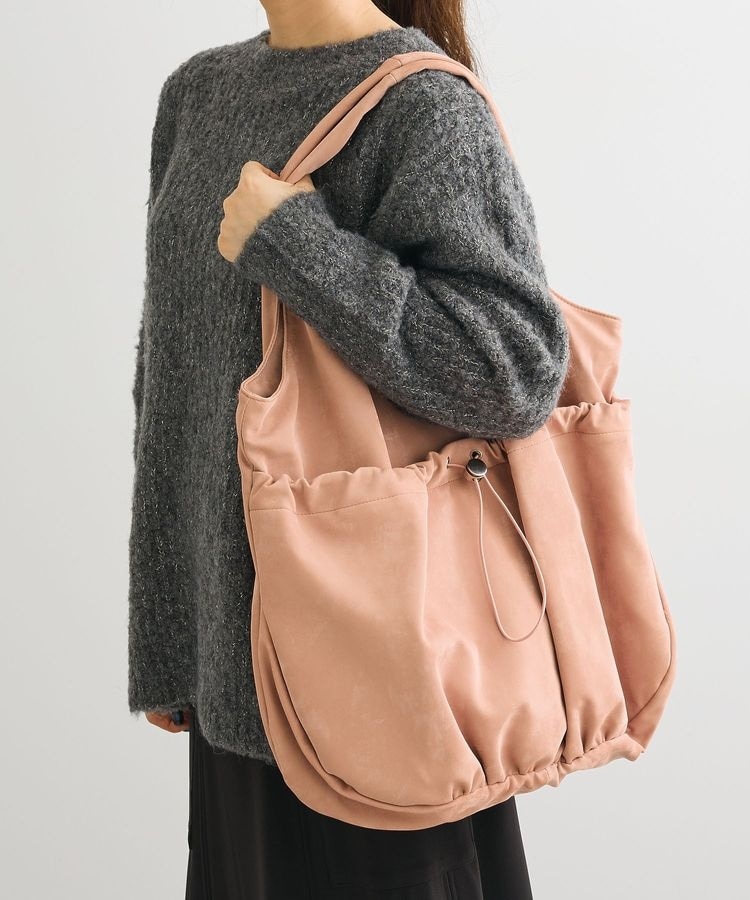 クラッシュ加工のような表情のある合皮素材で仕立てたBIGサイズのデザインバッグ。外ポケットにドロストを施し、裾ギャザーで丸みをだしたバルーンフォルムが特徴的です。安心のファスナー間口でA4サイズの書類もすっぽり収まる実用的な収納力。秋冬スタイルに馴染みやすいカラーリングでスタイリングにほんのり甘さをプラスしてくれるおすすめのアイテムです。※モデル着用画像は、光の当たり具合で色味が違って見える場合がございます。※お使いのモニター環境によって商品の色味が違って見える場合がございます。