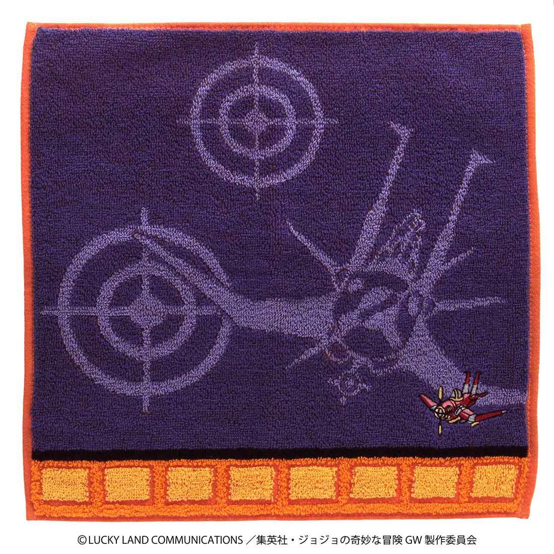 ナランチャ・ギルガのスタンド"エアロスミス"をモチーフにしたタオルハンカチです 。ベースカラーはナランチャ・ギルガの衣装パープルと オレンジイエローでまとめました。キャラクターのイメージをジャカード織で表現。表面の凹凸が楽しい1枚となっています。