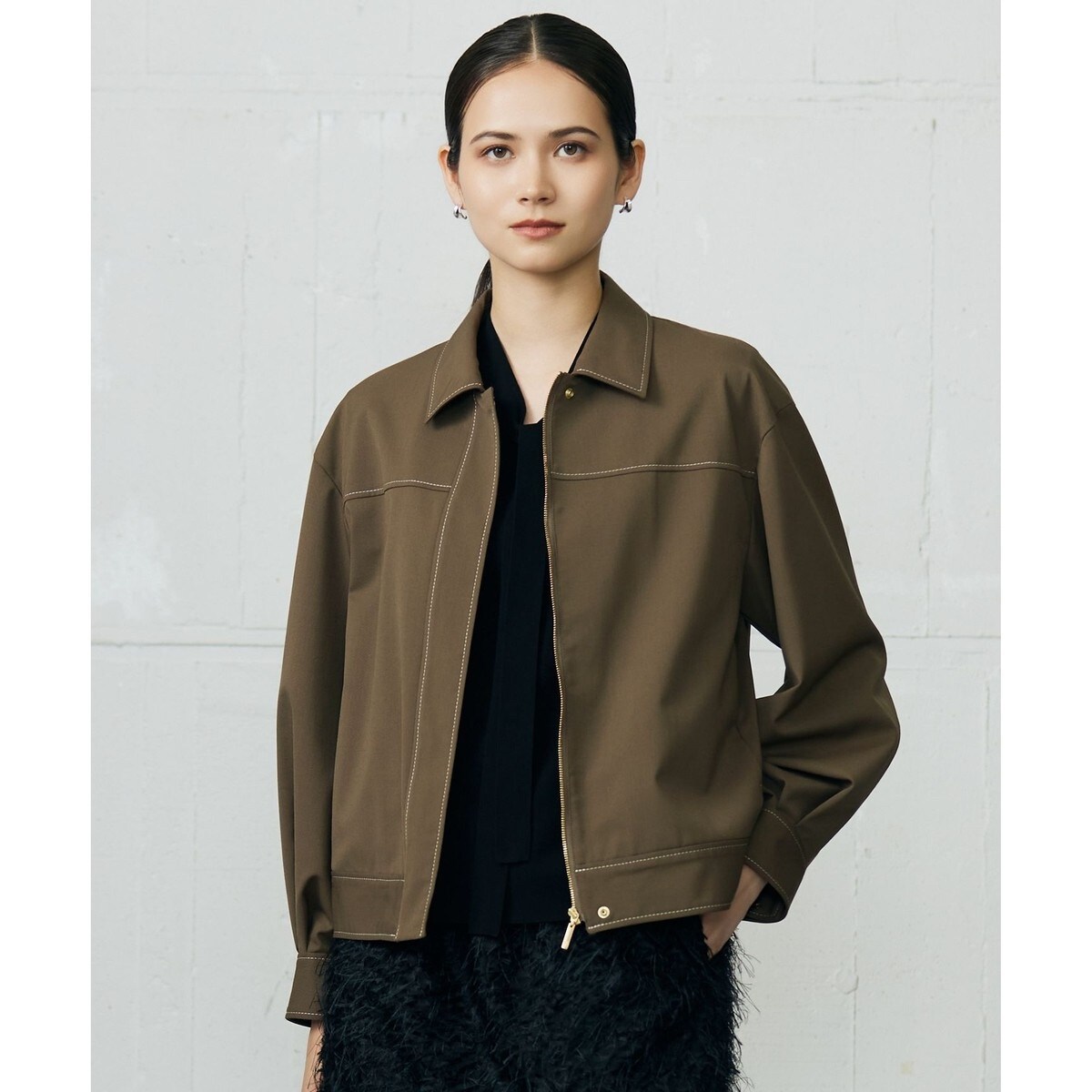 大人っぽい印象のデニム調ジャケット■デザインフォルムスリーブがポイントのジャケットです。コンパクトな丈感でパンツやスカート、ワンピースなど様々なものと合わせやすいバランスです。シームのポケットや、ファスナーを見えない仕様にすることで、カジュアルなアイテムながら大人っぽい印象です。※モデル画像はサンプルを使用しております。ブラウン(035)は実際にお届けする商品はステッチの色が生地と同色になります。正しい仕様は物画像(モデル画像ではない画像)をご参照ください。■素材スパンポリエステルと細番手メリノウールの混紡糸を使用した、ウール混できれいめなデニムライク素材です。裏糸に白い糸を使用し、表からその糸が少し見えるようにすることで、デニム調のシャンブレー感を表現しています。ウォッシャブルで洗ってもシワになりづらく、ストレッチ性もある素材です。■同素材アイテムカーブテーパードパンツ(PRWMGW0408)ワイドパンツ(PRWMGW0407)ワンピース(OPWMGW0407)