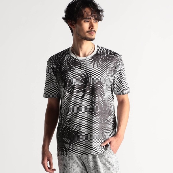 絶妙なモチーフバランスにこだわったインパクト系総柄プリントTシャツ。ジオメトリック柄とボタニカル柄を組合せ、グラデーションにより奥行き感をつけることで立体感を生み出しています。陰影をモノトーンカラーで表現し、存在感のあるデザインに仕上げました。昇華転写の加工技法を使い、生地の風合いを損ねることなく繊細に仕上げています。