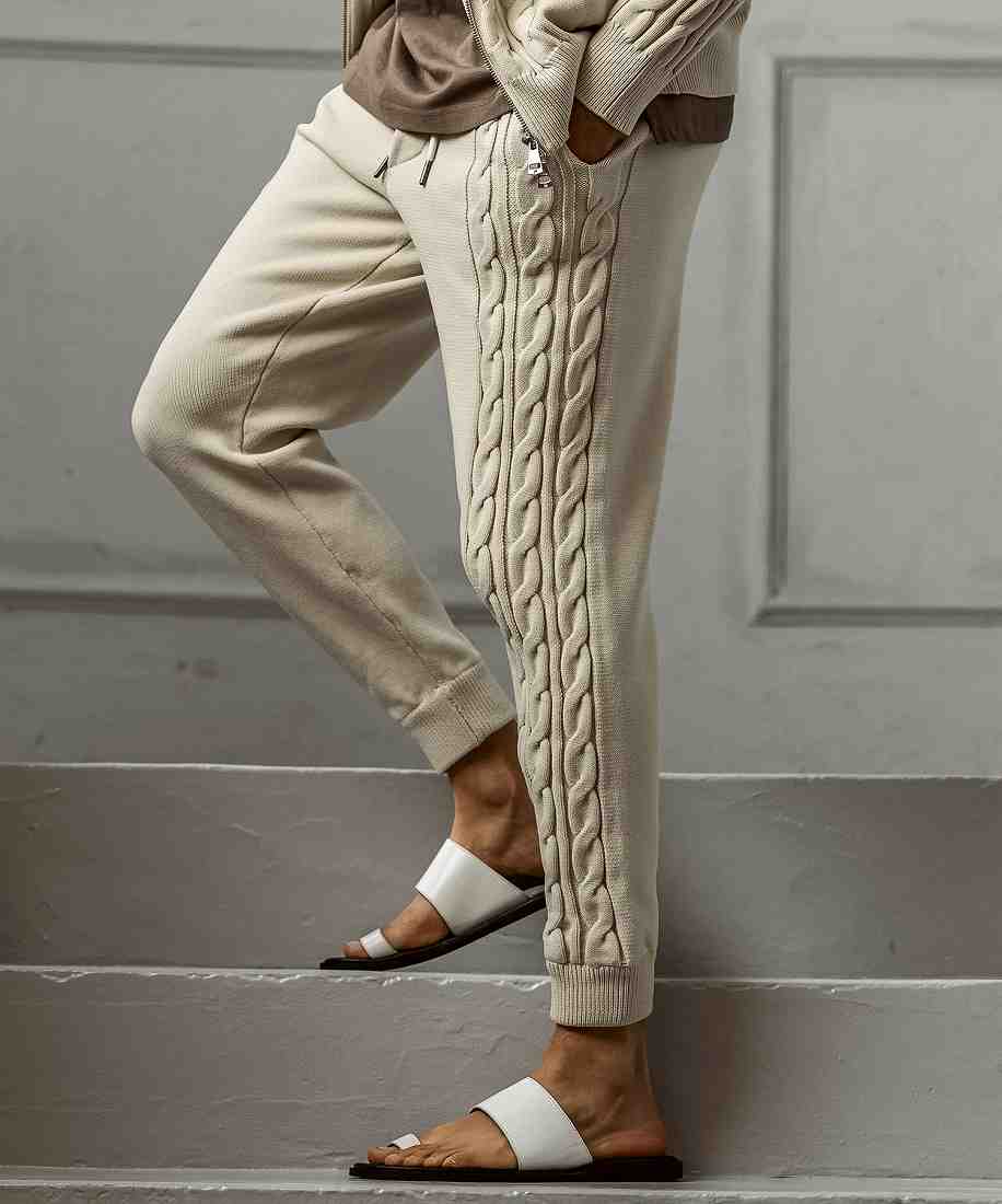 立体感のあるクレイジーパターンケーブルが目を引くニットパンツ。