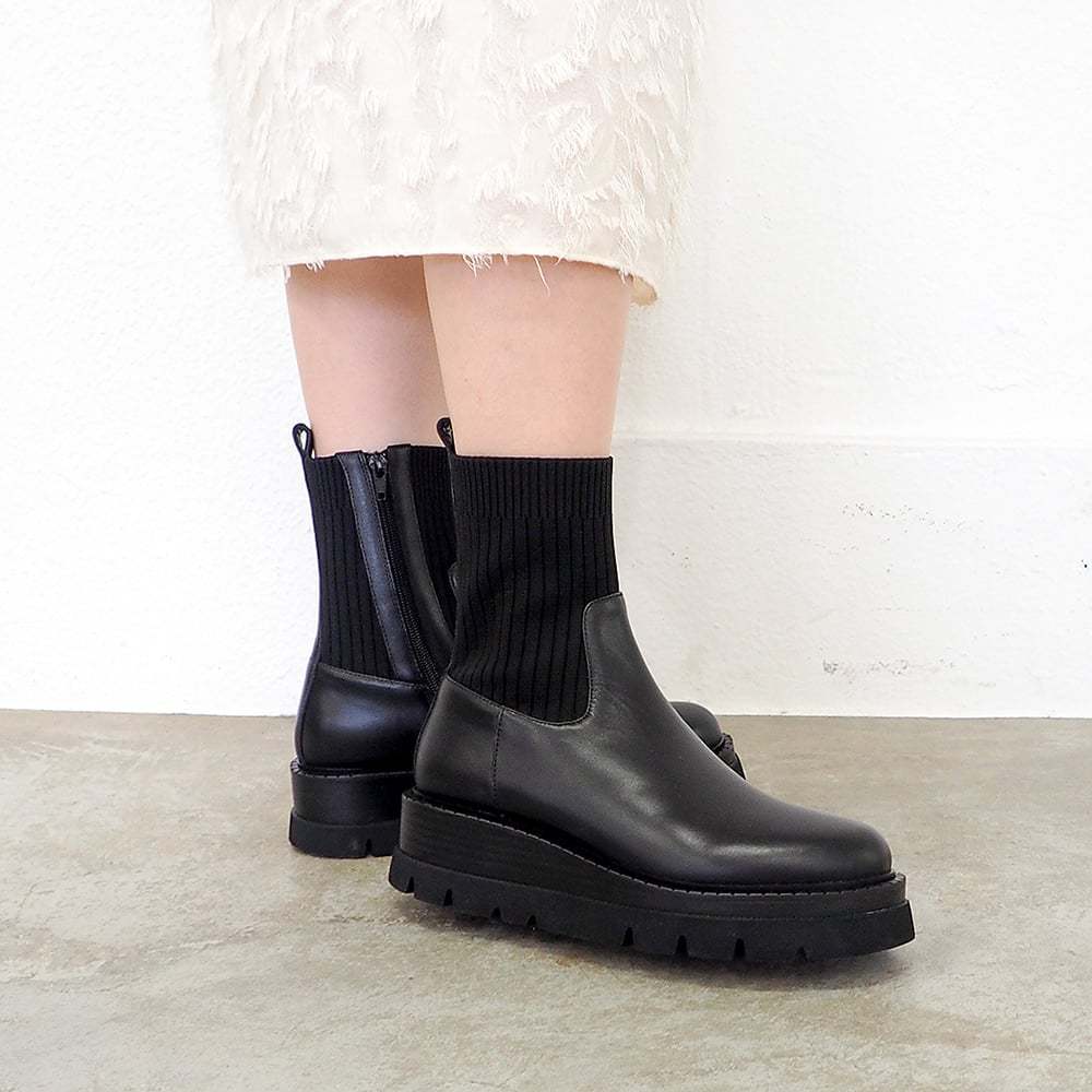 特徴的な2段の厚底ソールにスマートなニットブーツのデザインを組み合わせた、大人の顔つきのカジュアルブーツ。