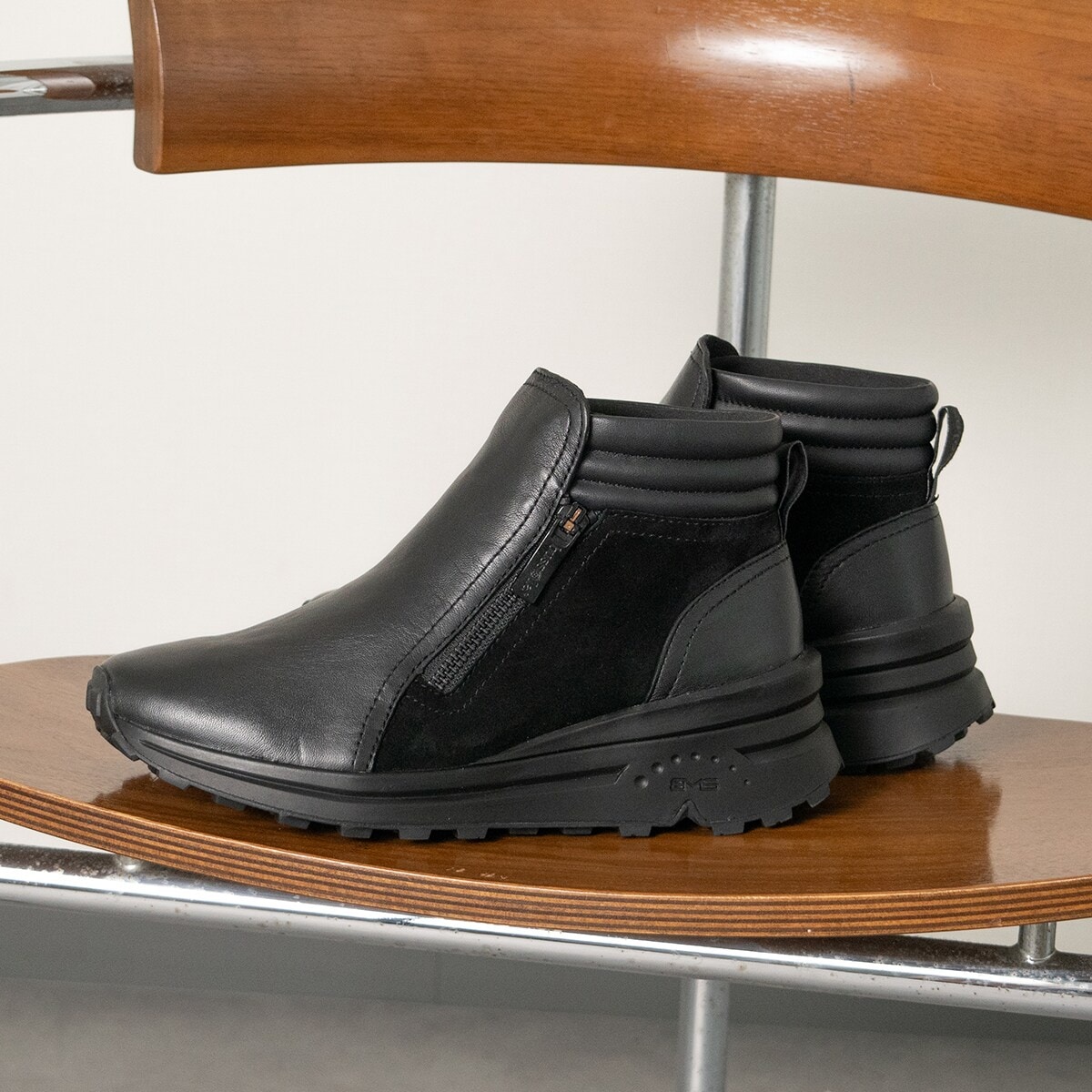 安定感のよい6cmヒールでスタイルアップ効果が期待出来そうな撥水加工のダブルジップショートブーツ。